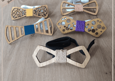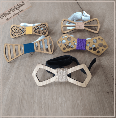 We design various decorative and other objects ourselves in our workshop: earrings, bow ties, clocks, personalized mirrors, key rings, panels/signs, etc. Each piece is unique! You can therefore order them as is or request additional customization.