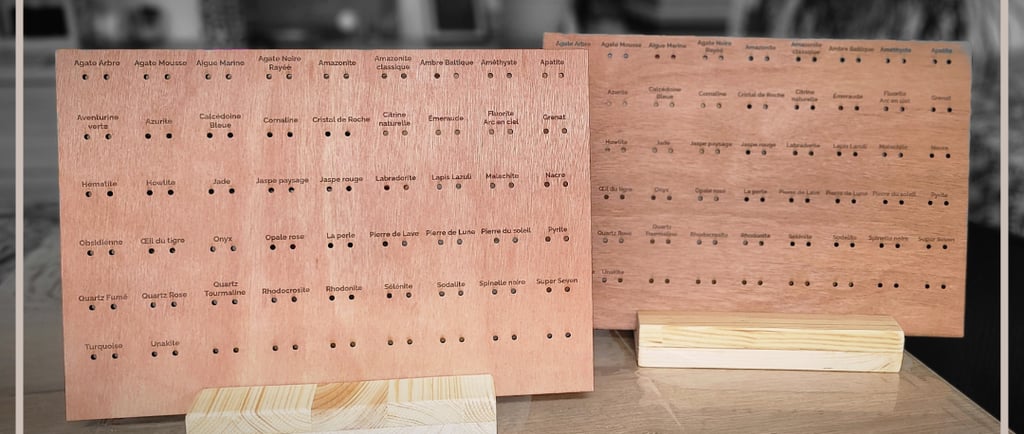Chaque présentoir a été conçu sur mesure pour mettre en valeur les créations uniques de Cathy. Grâce à la technologie de gravure laser, j'ai pu inscrire avec précision le nom de chaque pierre naturelle directement sur les supports. Cette personnalisation permet aux clients de découvrir immédiatement les propriétés et l'origine des pierres utilisées dans les boucles d'oreille exposées.