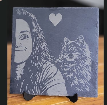 La gravure sur ardoise photo est particulièrement populaire pour les portraits d’animaux. Ce support offre un contraste profond qui met en valeur les détails du pelage et les expressions.